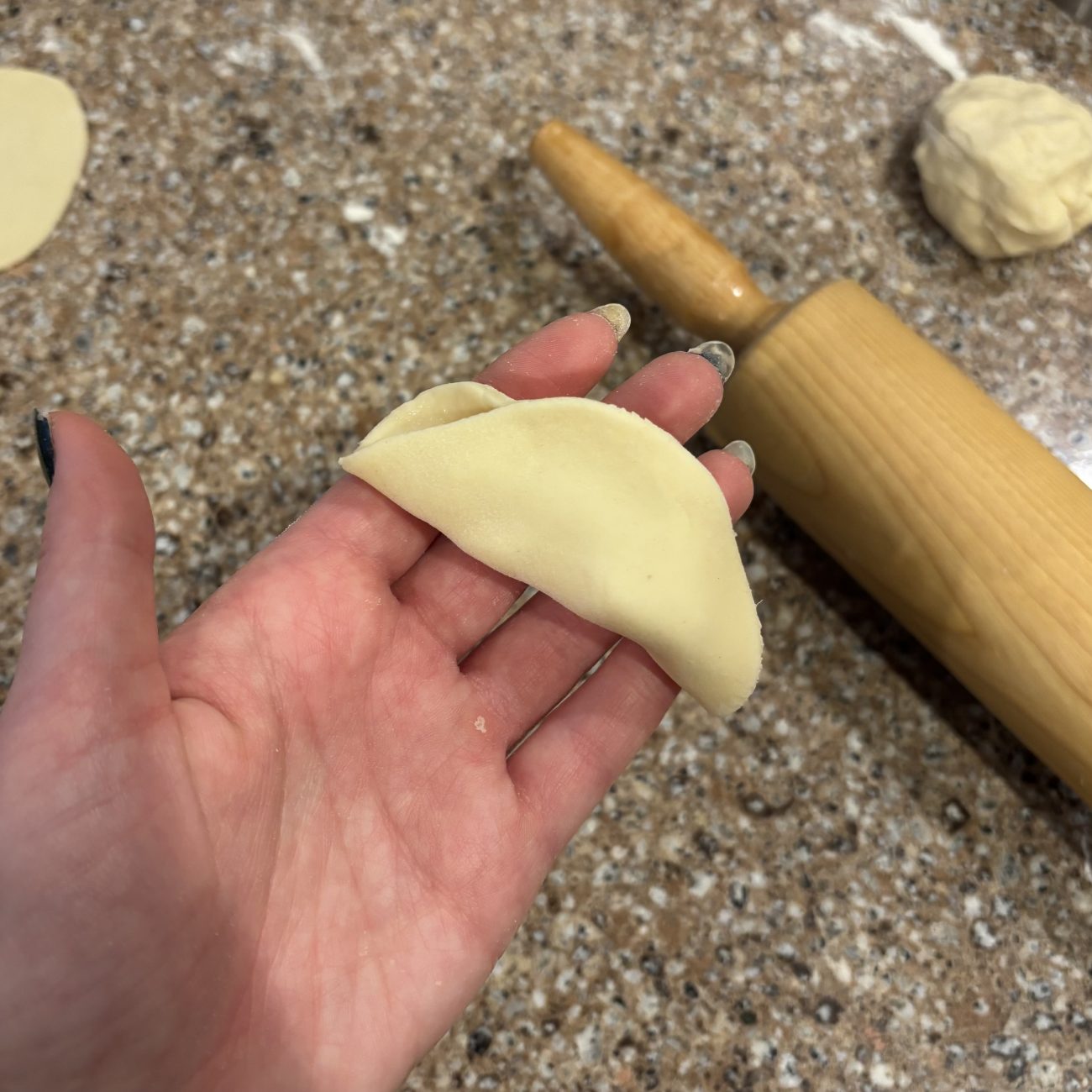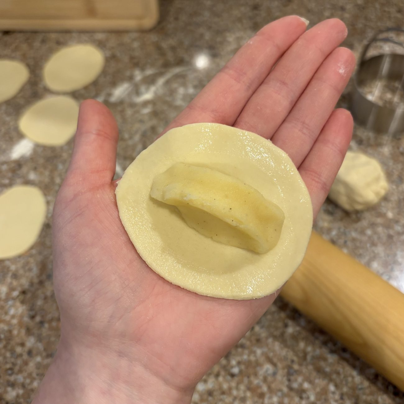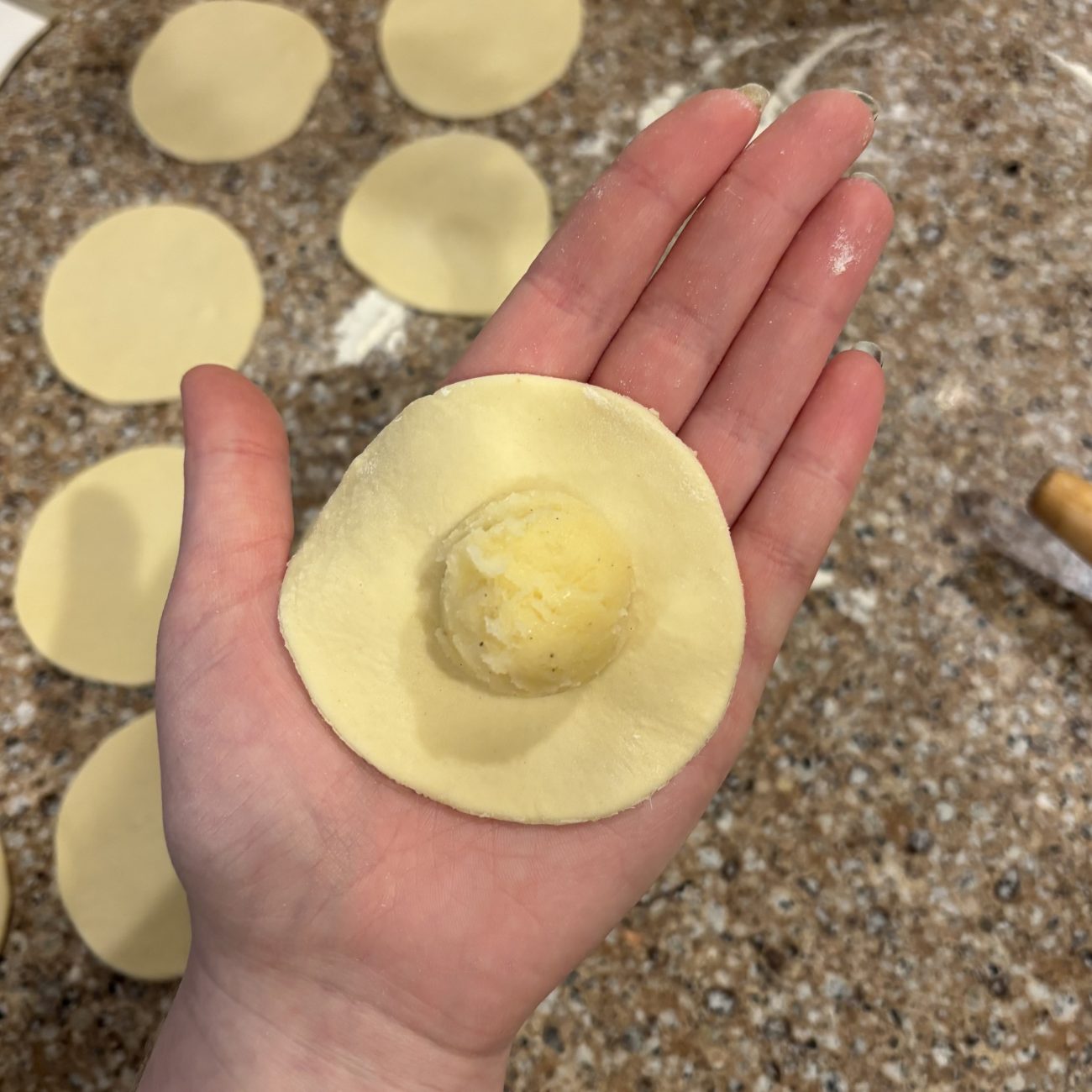 Prepare FillingsFor potato filling: Boil 2-4 large russet potatoes (peeled and cubed) in salted water until fork tender. Drain, mash, and combine with shredded cheddar, salt, and pepper (I like to use a hand mixer for this!). For sausage filling: Dice smoked sausage and mushrooms into small pieces. Sautee over medium heat until lightly browned. In a bowl, combine the sausage and mushroom mixture with chopped sauerkraut, salt, and pepper to taste. I usually add some of the potato mixture to help it all stick together for ease of filling. |