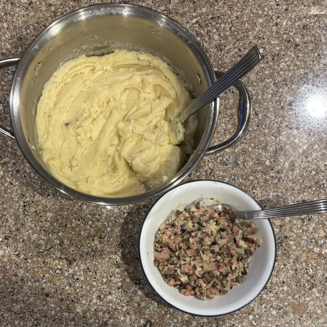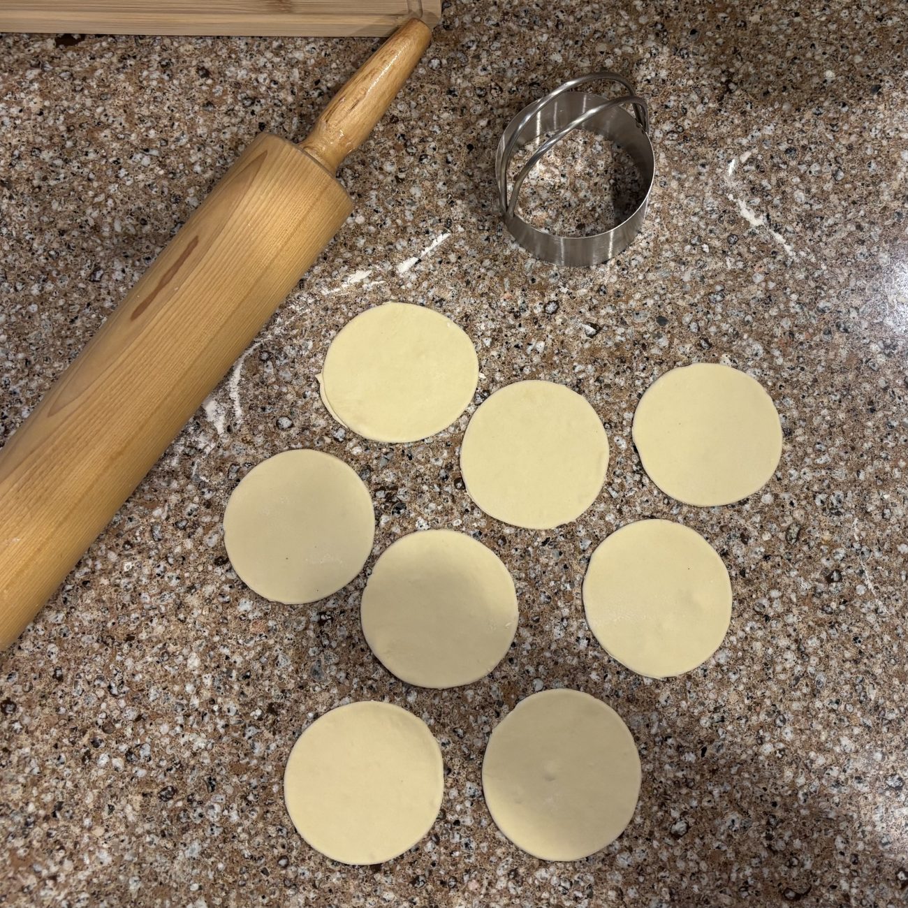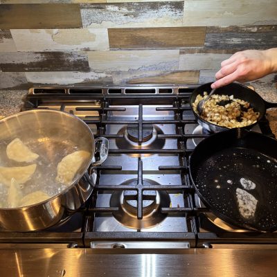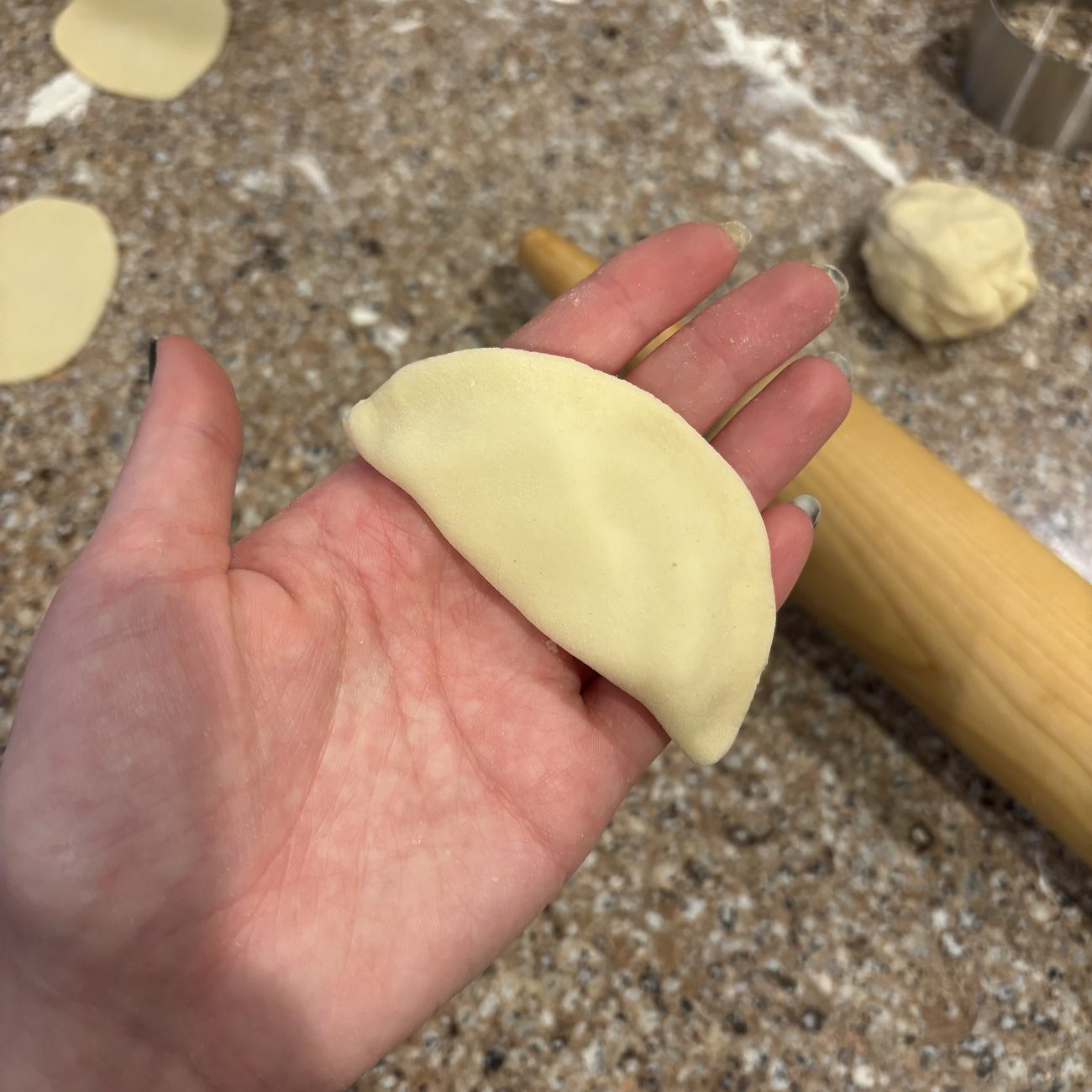 Prepare FillingsFor potato filling: Boil 2-4 large russet potatoes (peeled and cubed) in salted water until fork tender. Drain, mash, and combine with shredded cheddar, salt, and pepper (I like to use a hand mixer for this!). For sausage filling: Dice smoked sausage and mushrooms into small pieces. Sautee over medium heat until lightly browned. In a bowl, combine the sausage and mushroom mixture with chopped sauerkraut, salt, and pepper to taste. I usually add some of the potato mixture to help it all stick together for ease of filling. |