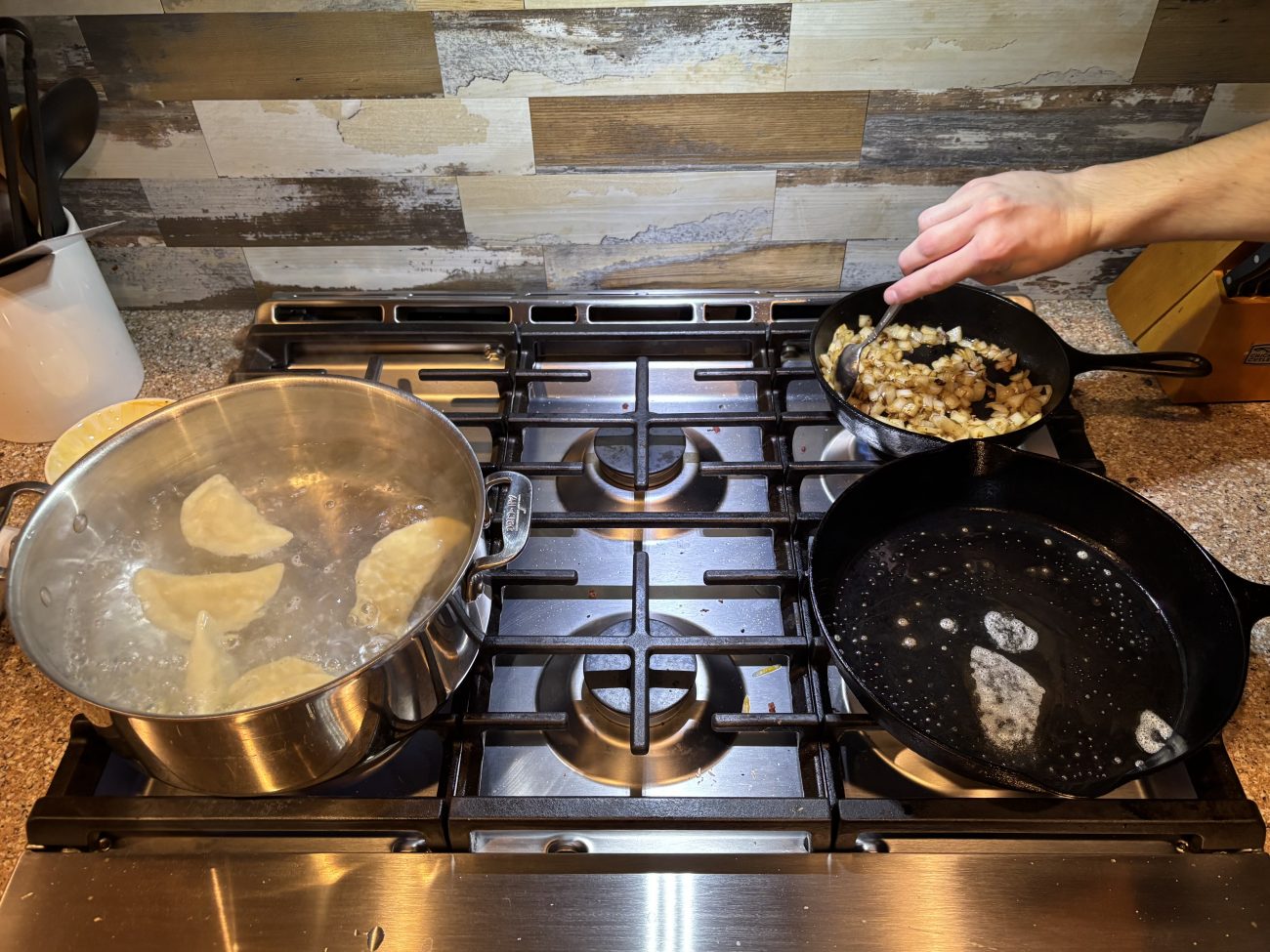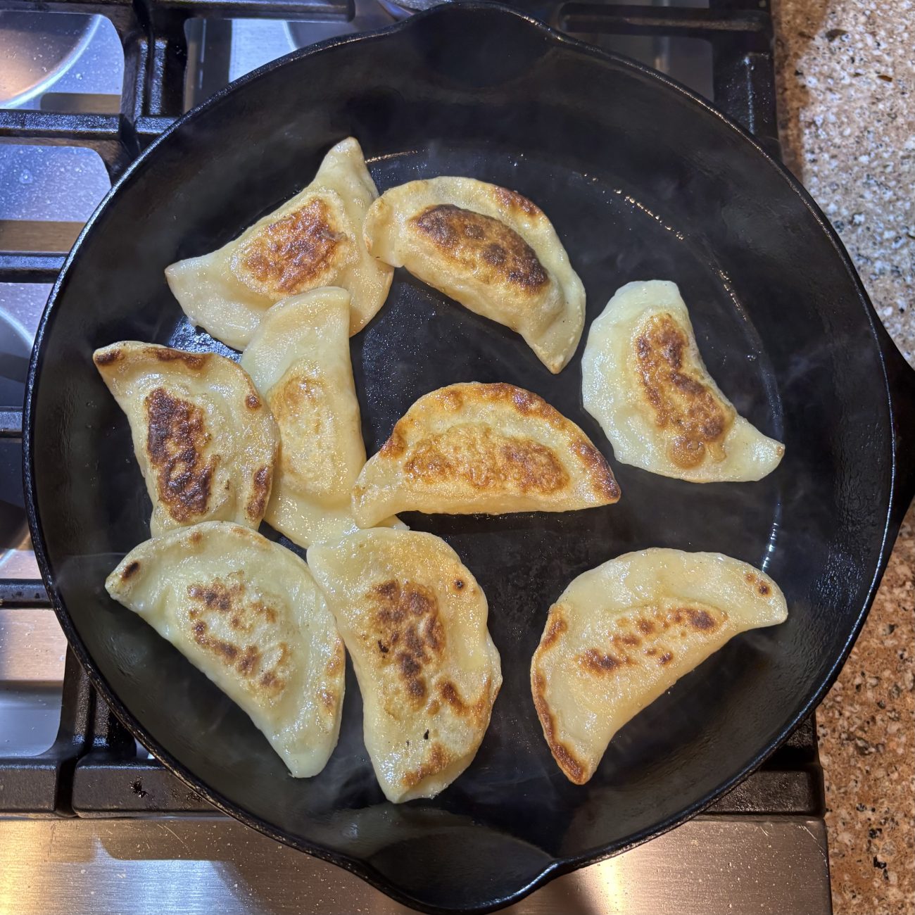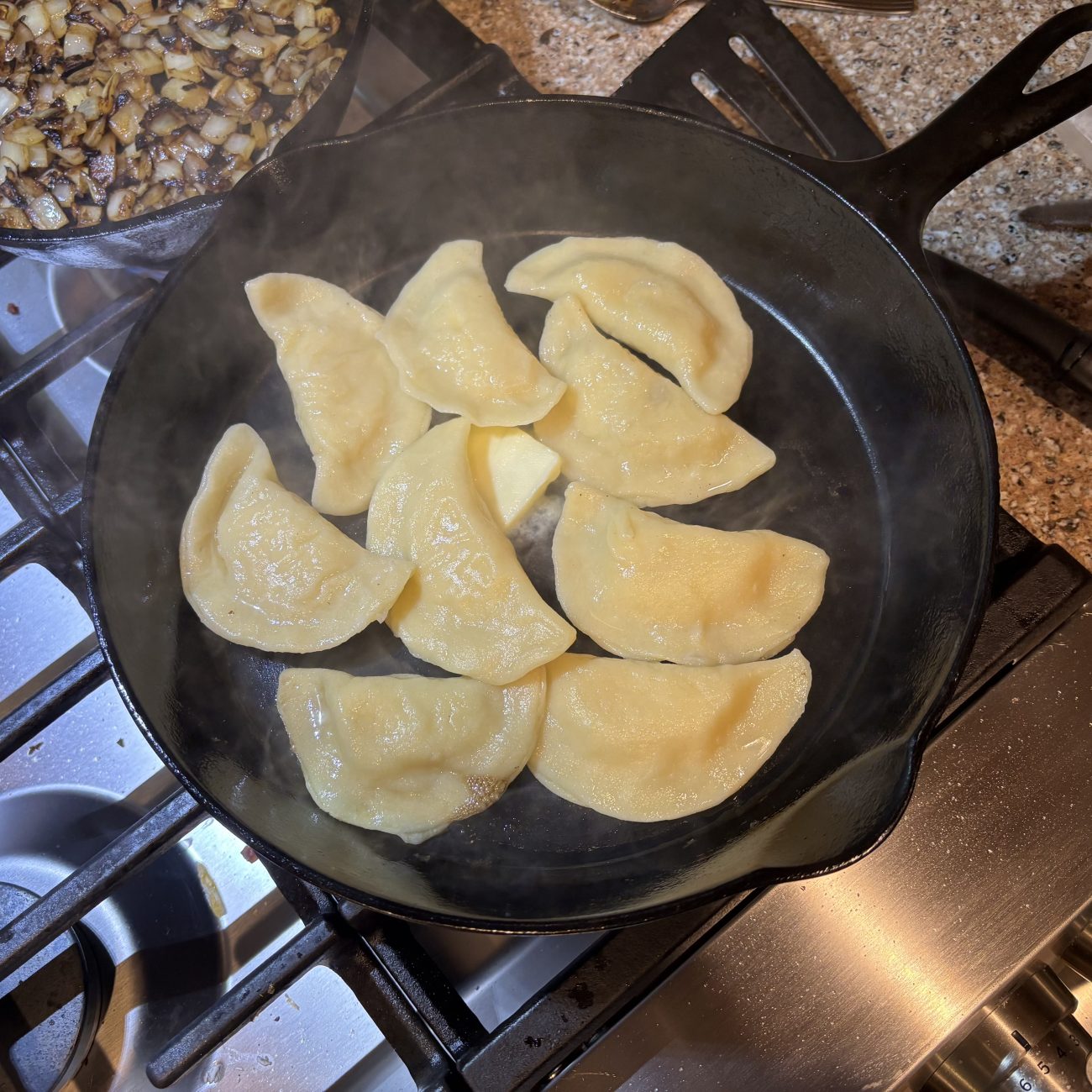 Cooking the PierogiSet a large pot of water to boil, salt well. Optionally (but highly recommended), also set a large skillet over medium heat. Add the pierogi to the water a few at a time, when they float, they're done! Using a slotted spoon, transfer the pierogi directly from the boiling water to the skillet with a lot of butter. Cook on each side until browned. Continue until all are cooked. |
